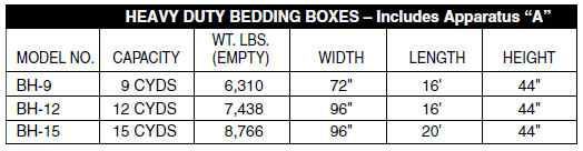 BH9, BH12, and BH15. The BH Heavy Duty box is just right for use with heavy machinery. The top frame is further strengthened by an inner core of hardwood. It is constructed of 3/8′ plate at sides and ends and 1/2″ plate on the bottom. Wear strips are on the inside bottom and a 44″ profile are standard on the heavy duty box. The clean sweep end and corners are reinforced for that extra toughness often required for many construction needs. Custom sizes are available.