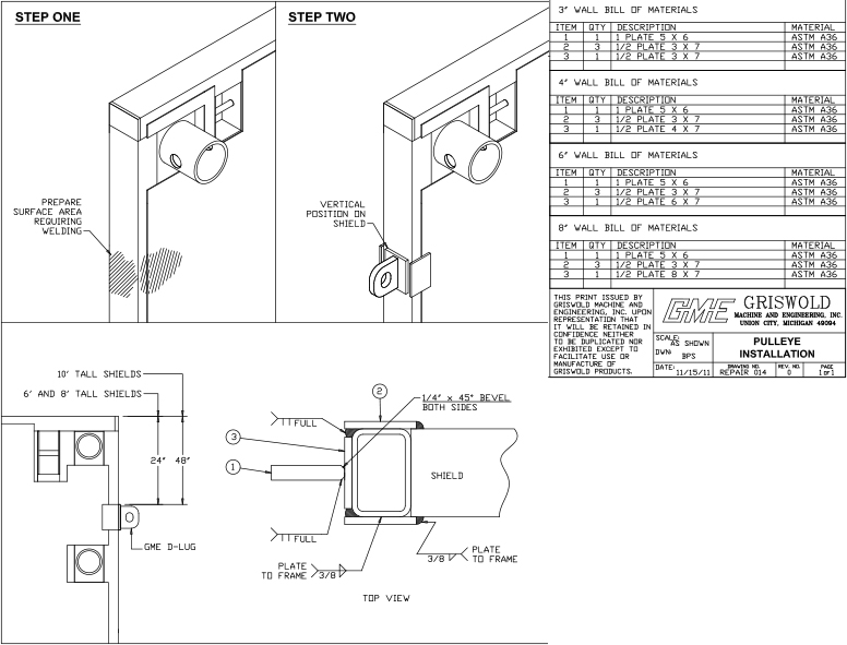 - Weld beveled D-lug (see detail) to item #2 plate. Place the assembly centered on the end of the shield. Follow by welding item #2 to both the interior and the exterior sides of the sheild. See “Top View” for weld details.