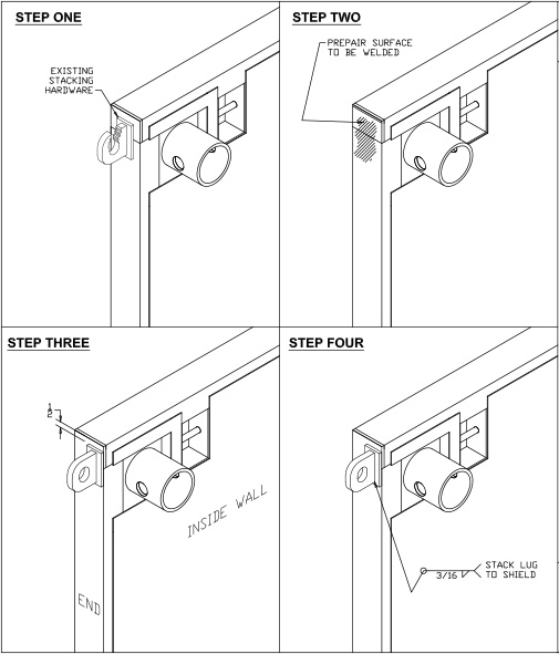 - Weld stack lug to the shield using a continuous 3/16″ fillet weld.